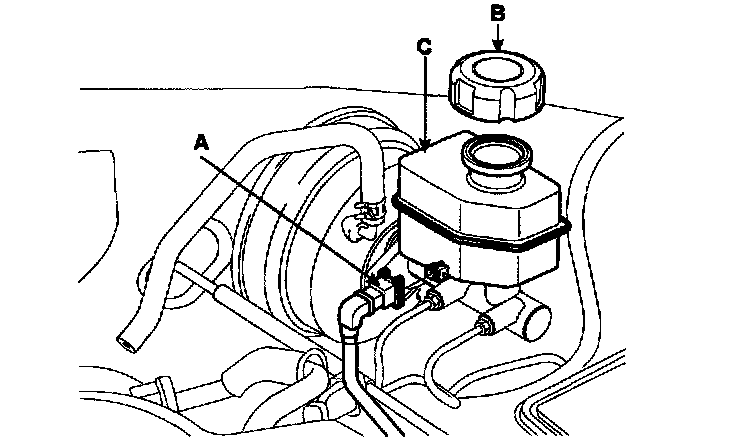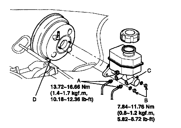 6. Remove the master cylinder (c) from the brake booster (D). Be careful not to bend or damage the brake lines when removing the master cylinder.