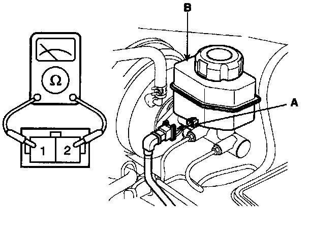 BRAKE FLUID LEVEL WARNING SWITCH1. Remove the connector(A) from the switch located at the brake fluid reservoir(B).