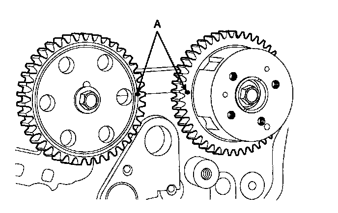 To install the timing chain with no slack between each shaft (cam, crank), follow this procedure. Crankshaft sprocket (A) -> Timing chain guide (B) Intake camshaft sprocket (C) -> Exhaust camshaft sprocket (D).
