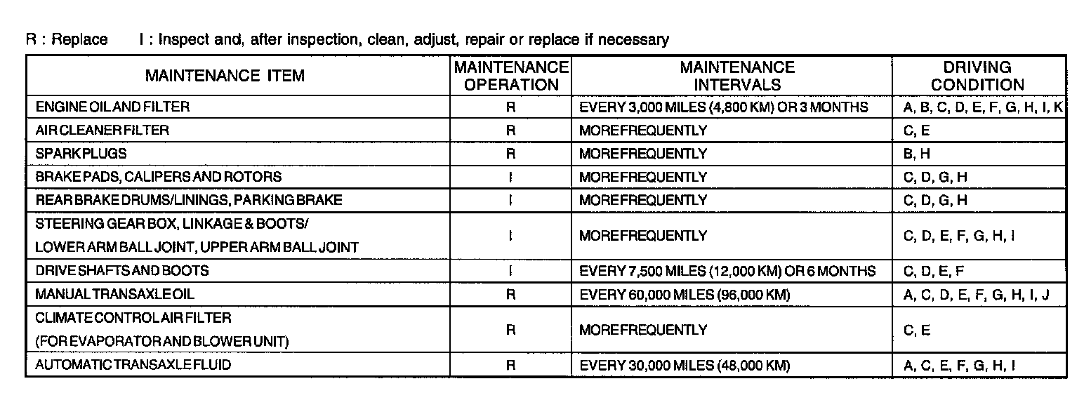 The following items must be serviced more frequently on cars normally used under severe driving conditions. Refer to the chart below for the appropriate maintenance intervals.