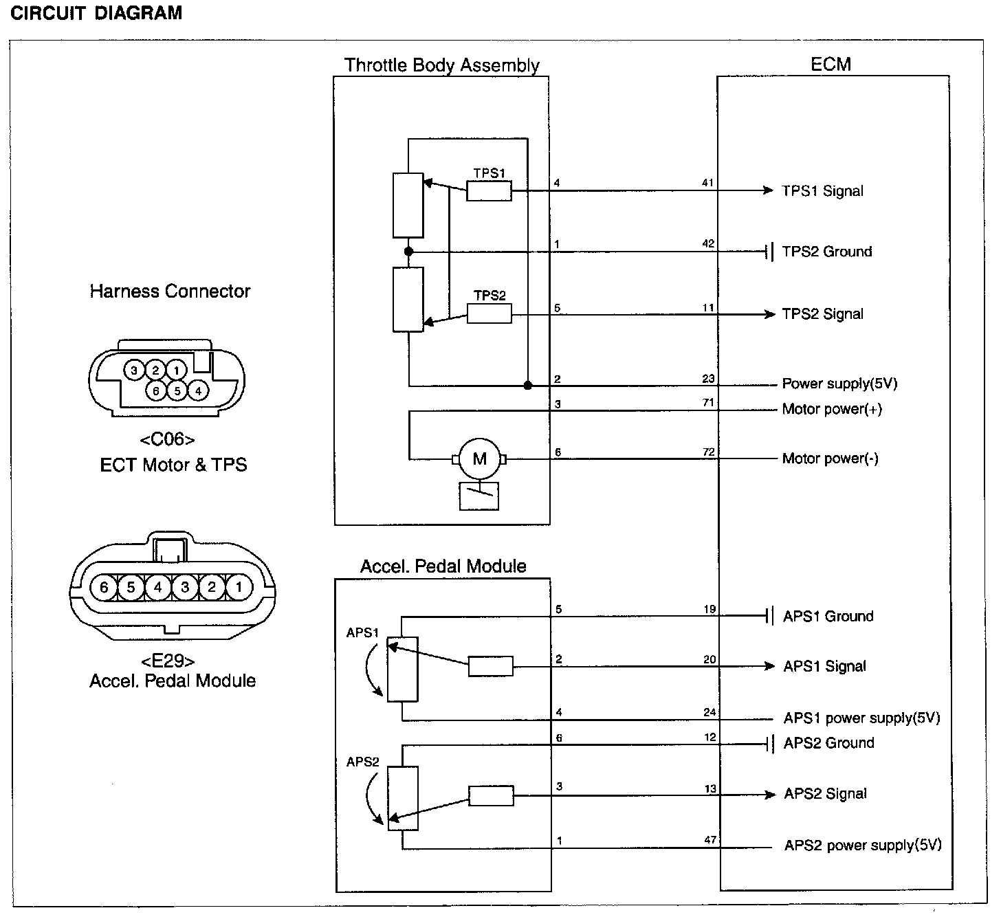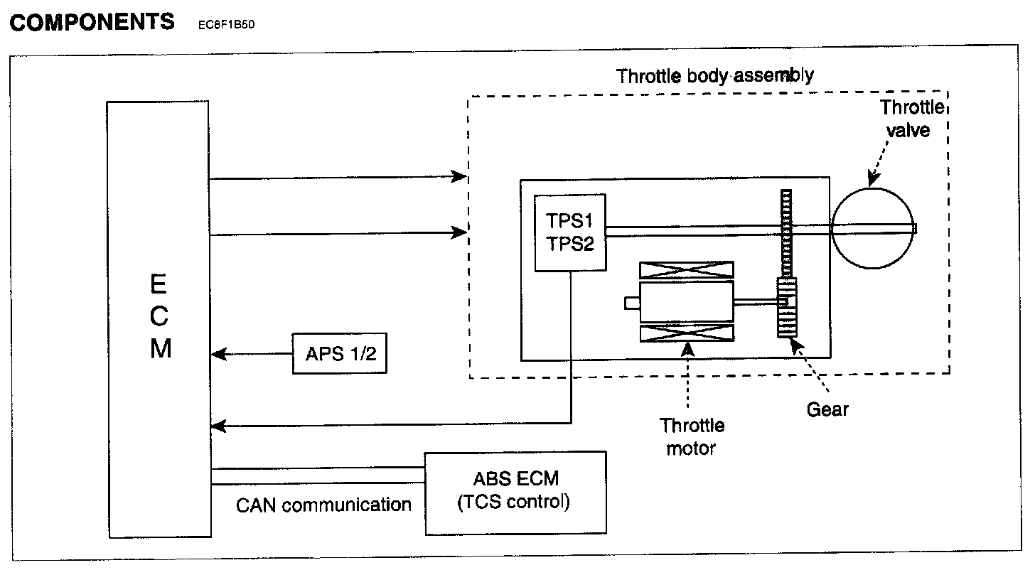 ETC (Electronic Throttle Control) system is installed in throttle. ETC system controls the opening angle of throttle valve to operate throttle valve control, idle speed control, traction control, auto cruise control and so on. ECM receives accelerator position sensor signals (APS1, APS2) and calculates appropriate throttle opening angle which is used to control the throttle angle of throttle motor. Throttle position sensor integrated into throttle body assembly detects the throttle opening angle (TPS1, TPS2) and sends it to ECM for feedback control.