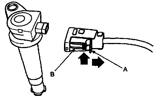 NOTE: when removing the ignition coil connector, pull the lock pin(A) and push the clip(B).
