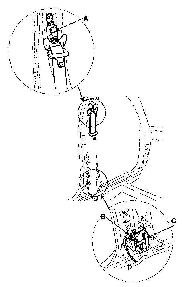 6. After disconnecting the pretensioner connector lock pin, remove the connector(B), Loosen the mounting bolt, then remove the pretensioner (C).