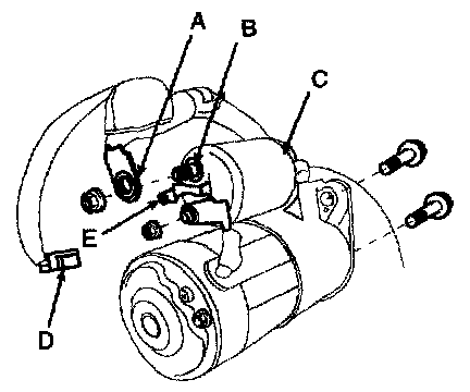 2. Disconnect the starter cable (A) from the B terminal (B) on the solenoid (C), then disconnect the connector (D) from the S terminal (E).