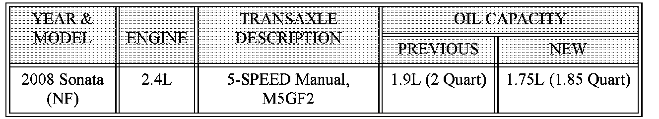 The manual transaxle oil fill capacity in the 2008 Sonata (NF) has been changed from 1.9L to 1.75L. Please use the information shown when servicing an affected Sonata vehicle.