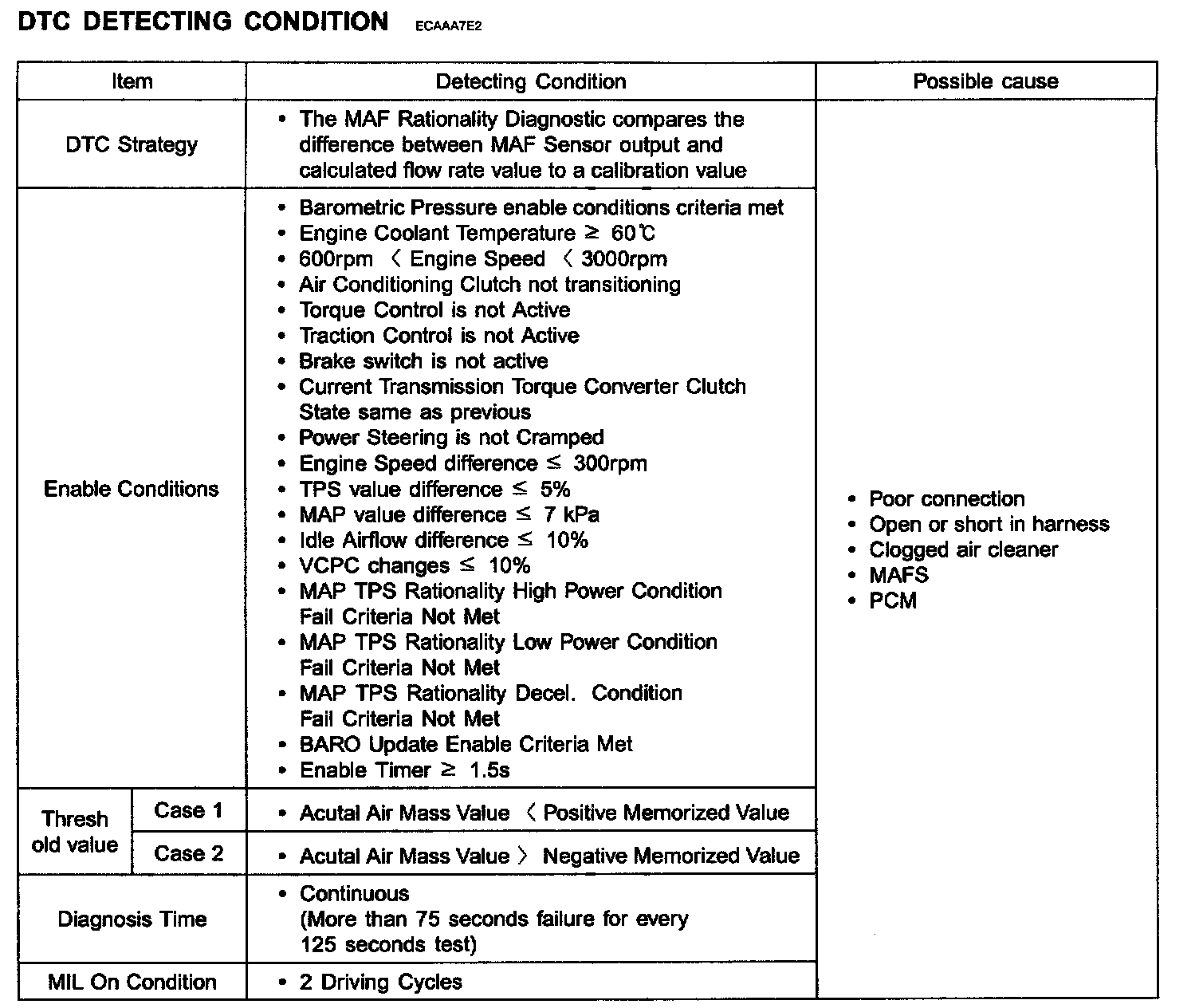 If the actual air flow is higher than Maximum threshold, or lower than Minimum threshold for more than 75 seconds failure for every 125 seconds test. PCM determines that a fault exists and a DTC is stored. MIL(Malfunction Indication Lamp) turns on when the malfunction lasts till consecutive 2 driving cycle.