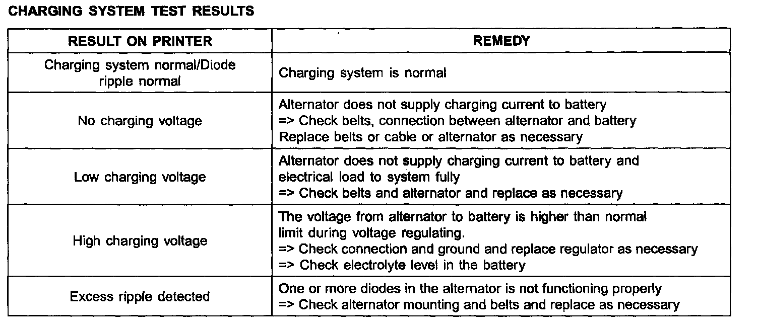 6. Take a relevant action according to the test results by referring to the table below after shutting oft the engine and disconnect the tester clamps from the battery.