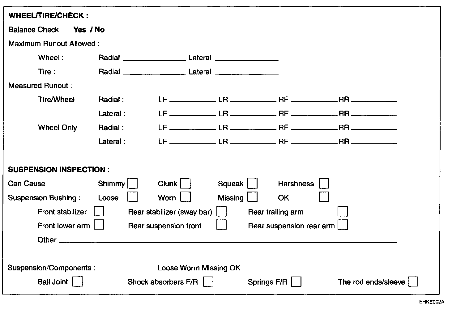 VEHICLE INSPECTIONTo assist the service advisor and the technician, check the suspension and wheel/tire condition with the questions listed below by filling them. It serves as a place to record information as well as data from the test to be carried out. To begin a successful diagnosis, fill out the questions.