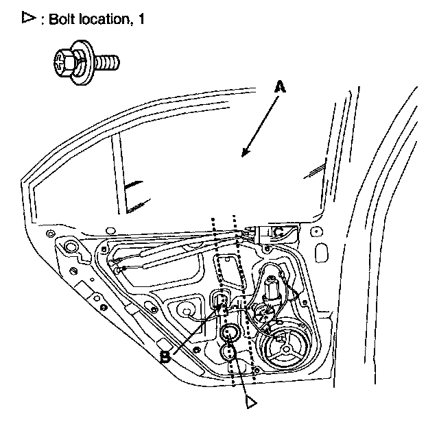 2. Carefully move the glass (A) until you can see the bolts, then loosen them. Separate the glass from the glass run and carefully pull the glass out through the window slot (B).