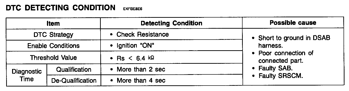 The SRSCM sets DTC B1380/B1384 if there is a short to ground in DSAB/PSAB harness.