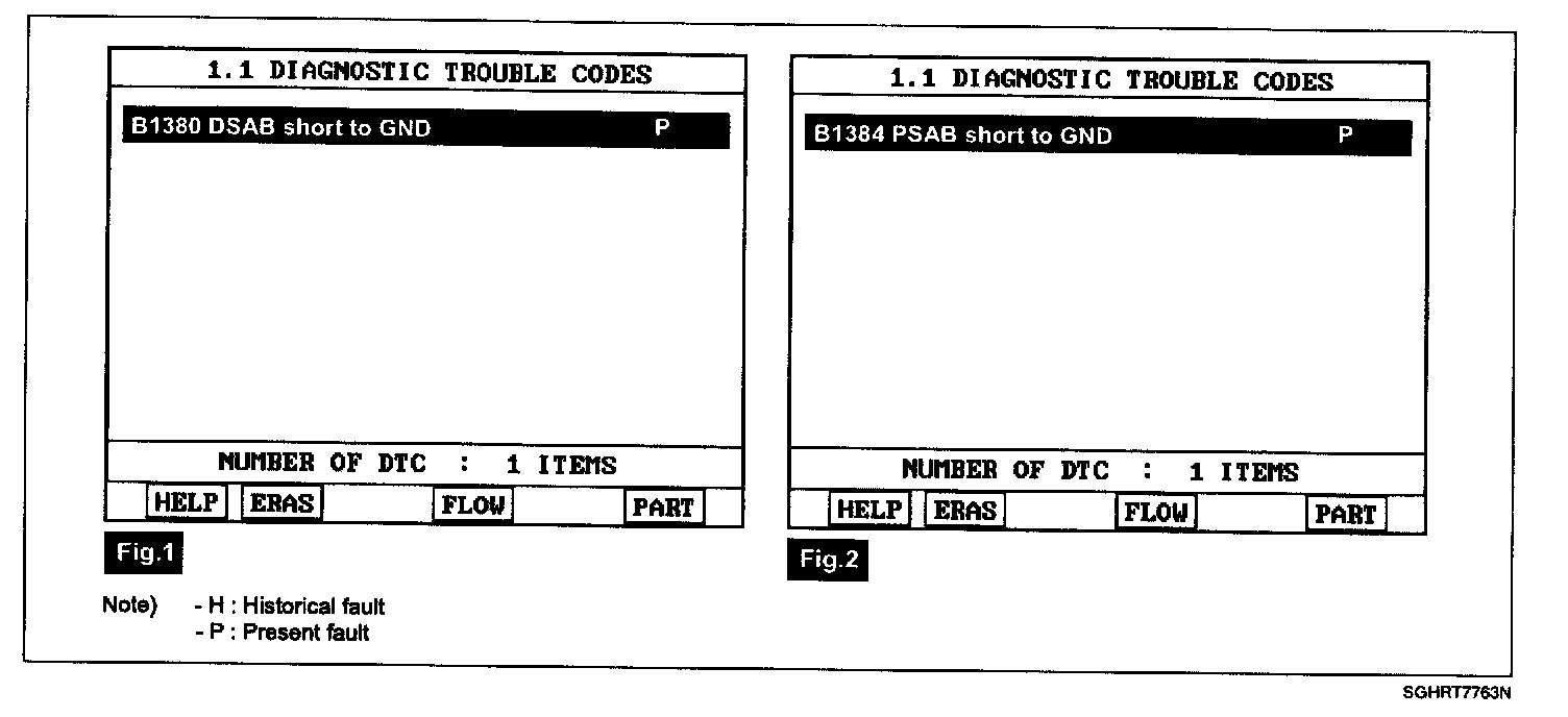 - Displaying nothing (no DTC) or DTC with label "H" (historical) shows that fault is intermittent caused by poor contact in the part's and/or SRSCM connector or was repaired and SRSCM memory was not cleared.