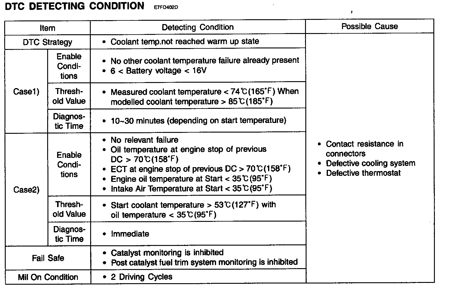 The purpose of this diagnosis is to detect a stuck coolant temperature signal. The diagnostic function checks whether after a variation of the calculated coolant temperature also a variation of the measured coolant temperature is detected. PCM sets DTC P0116 when the variation of measured engine coolant temperature from engine start is smaller than threshold while variation of calculated coolant temperature by PCM is greater than threshold.