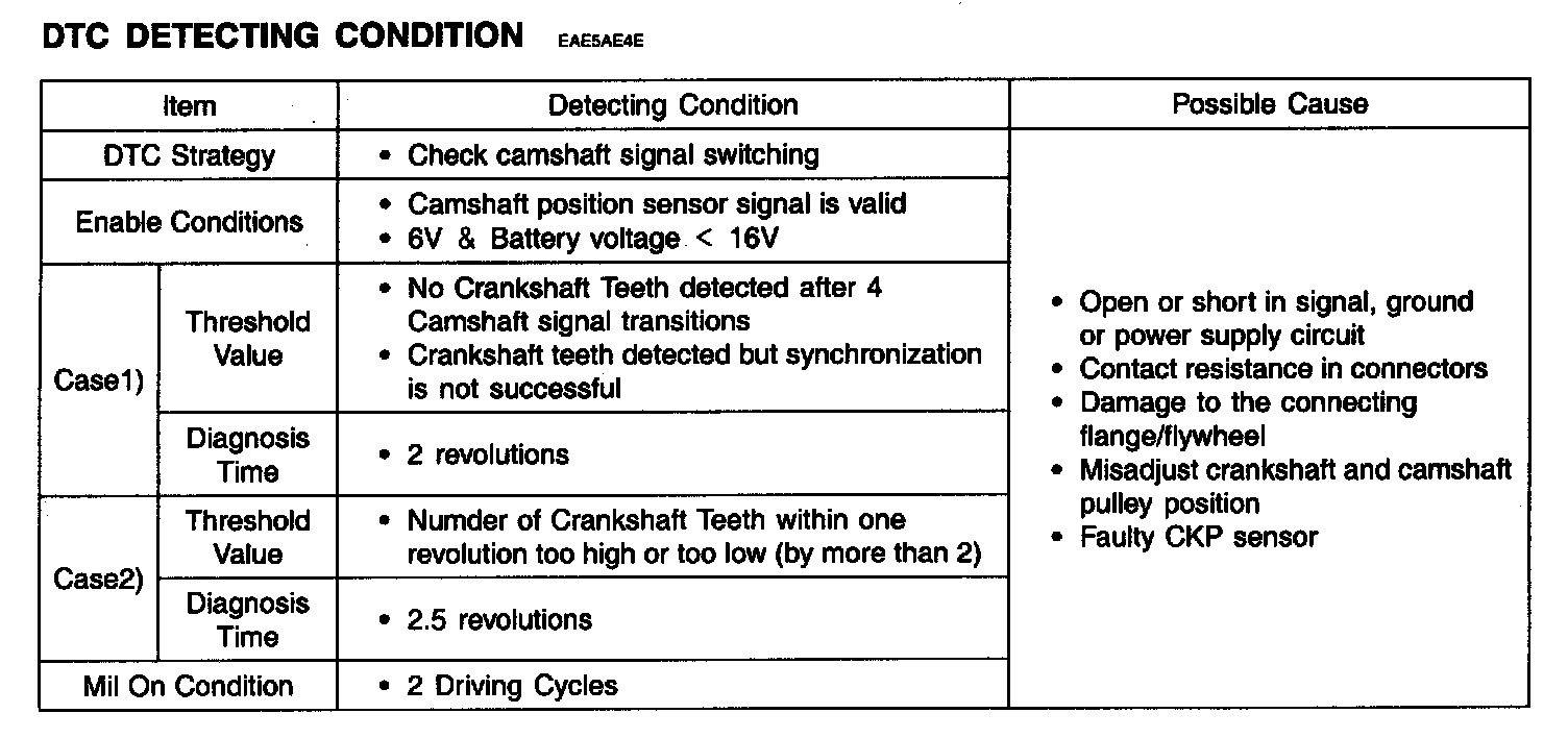 The PCM sets DTC P0335 when the number of crankshaft teeth during one revolution is incorrect or crankshaft signal is missing while camshaft signal is detected.