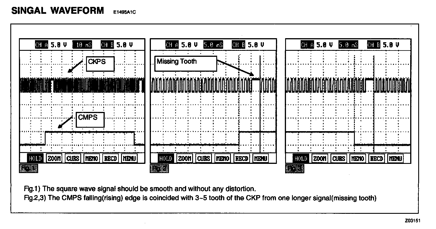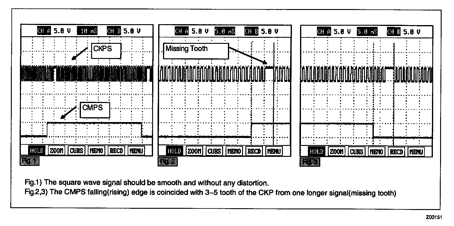 3. Start the engine and check for signal waveform whether synchronize with camshaft sensor or not and tooth is missing.