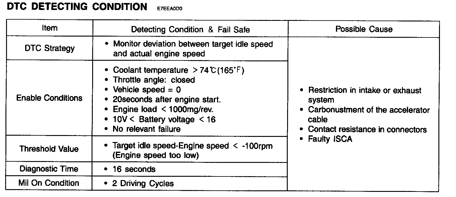 The PCM monitors engine speed deviation from the target idle engine speed when the vehicle is stopped and the idle speed valve opening is stable. The PCM sets DTC P0506 if the difference to the target idle engine speed is lower than the predetermined threshold.