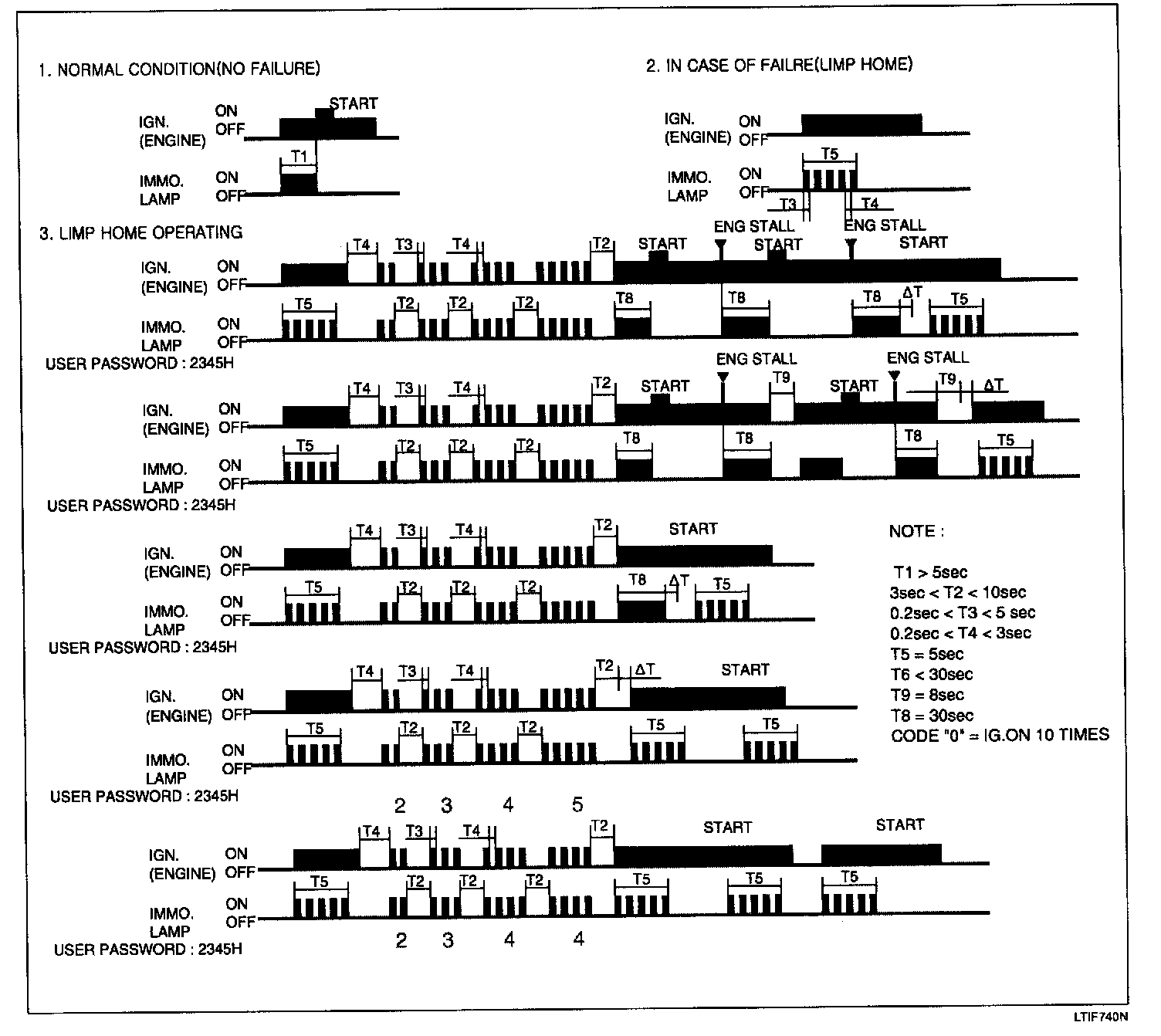 The limp home can be activated also by the ignition key. The ECM informs the driver by blinking the immobilizer indicator for the limp home condition. Then the user password can be input to ECM that can be done by special sequence of ignition on/off as picture above. Only if the ECM is in status " learnt" and the user password status is " learnt" and the user password is correct. the ECM will be unlocked for a period of time (30 sec.). The engine can be started during this time. After the time has elapsed, engine start is not possible. After a new password has been input the timer (30 sec.) start again. After ignition off the ECM is locked (If timer 8 sec. is elapsed). For next start the input of user password is requested again.