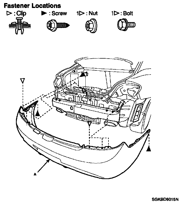 4. Loosen the rear bumper mounting bolts and screws, then rear bumper (A).