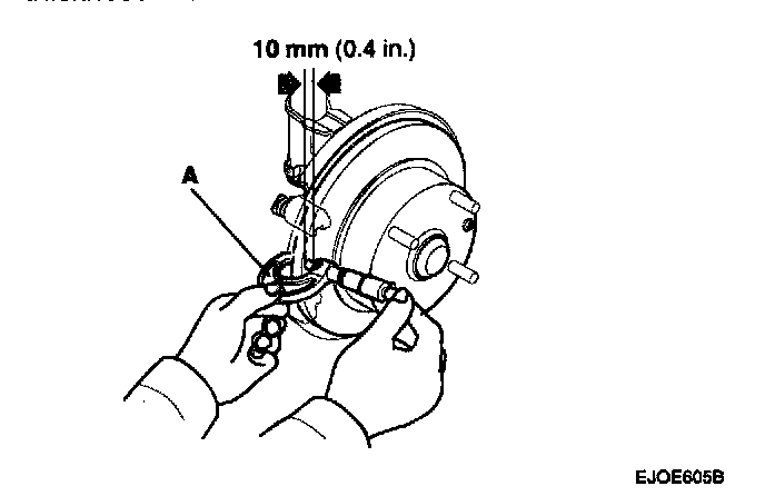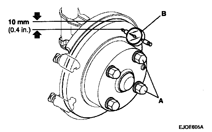 4. Use wheel nuts and suitable flat washers (A) to hold the disc securely against the hub, then mount a dial indicator (B) as shown, and measure the runout at 10 mm (0.4 in.) from the outer edge of the disc.
