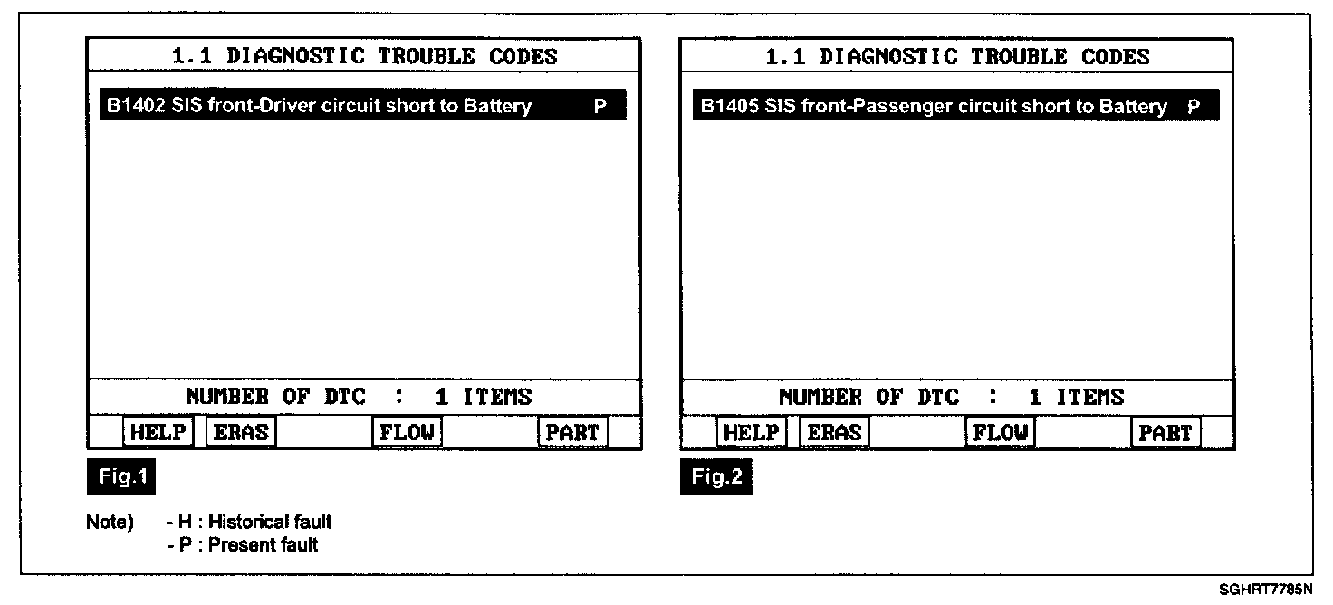 - Displaying nothing (no DTC) or DTC with label "H" (historical) shows that fault is intermittent caused by poor contact in the part's and/or SRSCM connector or was repaired and SRSCM memory was not cleared.