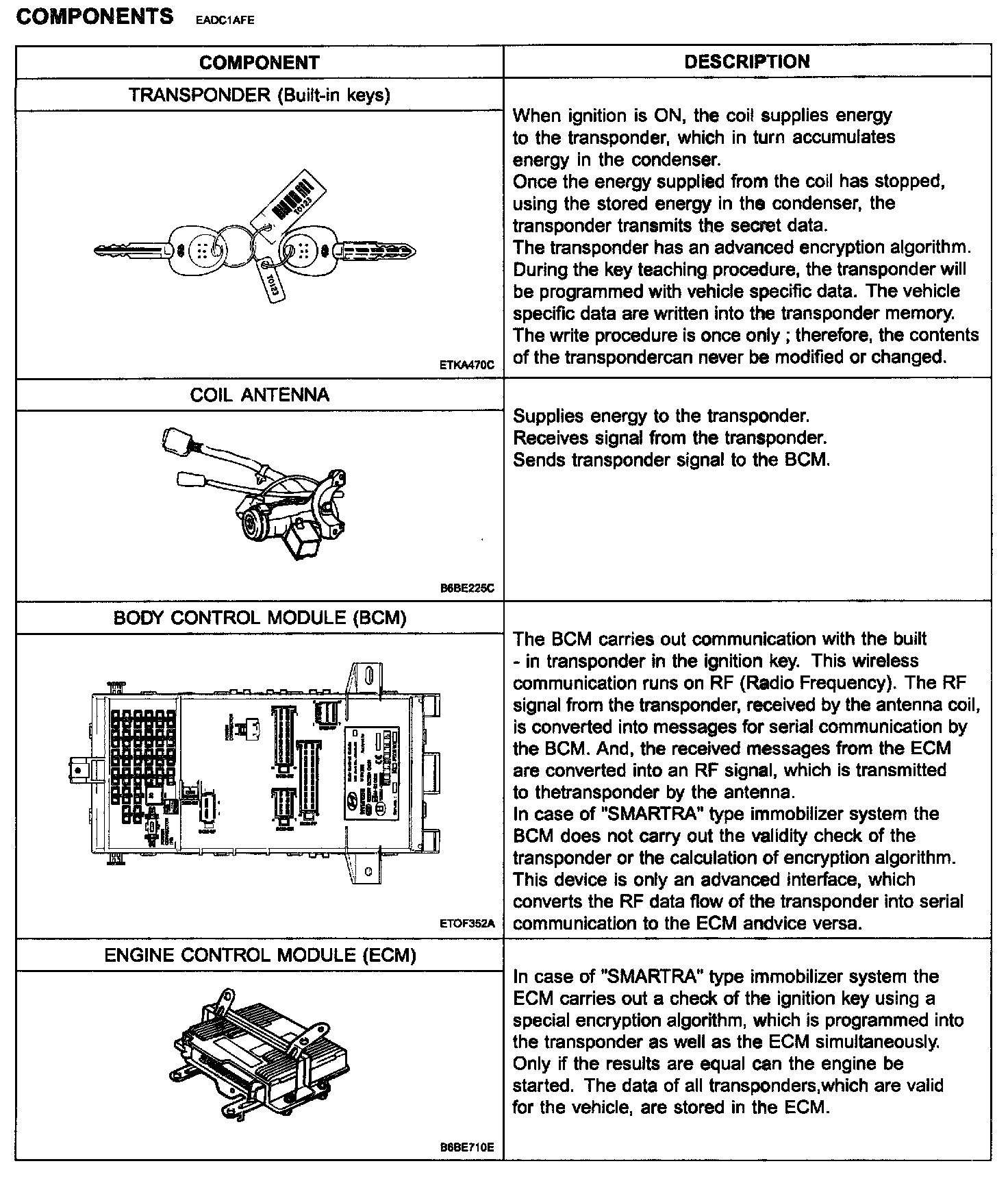 The immobilizer system consists of a passive challenge-response (mutual authentication) transponder inside the key head, a stand alone antenna, the BCM unit and the ECM. The BCM unit shall emulate the original SMARTRA immobilizer as closely as possible. In this document, the BCM emulating the original SMARTRA shall just be known as SMARTRA.