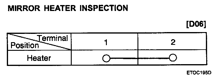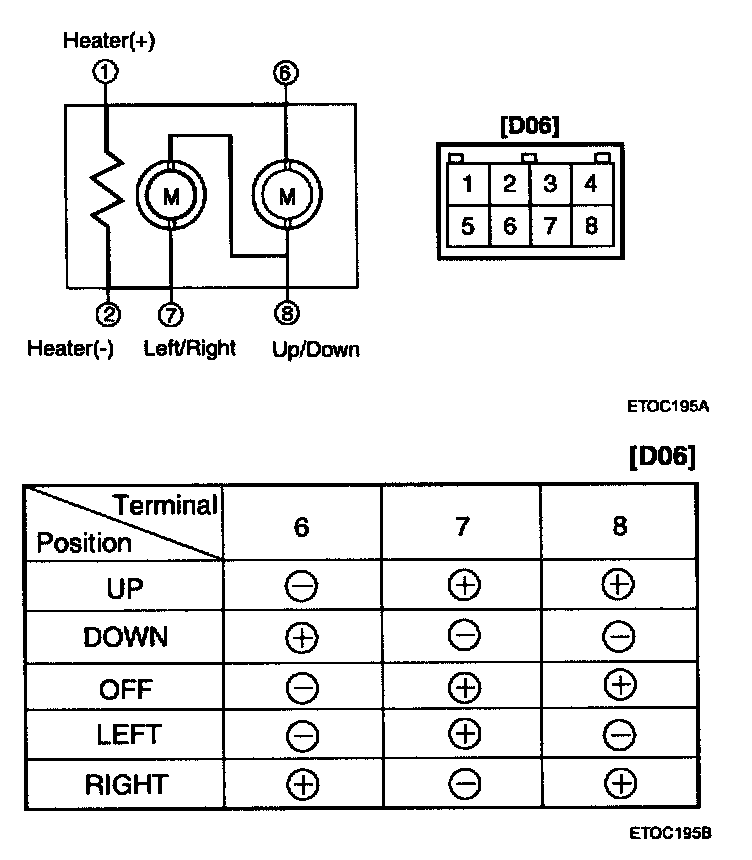 2. Apply battery voltage to each terminal as shown in the table and verify that the mirror operates properly.