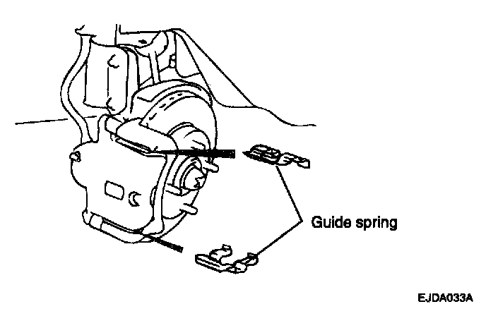 ^ When replacing the brake pad, check for deformation. When replacing the guide spring, use a new one or the used one after cleaning away foreign material.