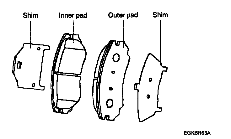 4. Install the new pads. The shims are attached to the each pad as illustrated.