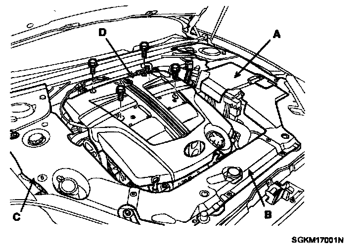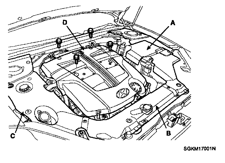 l. Remove the side cover(A, B, C) and the engine cover(D).