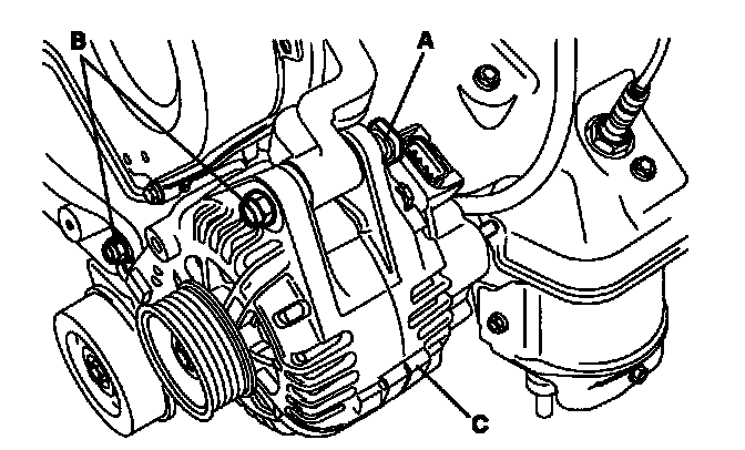 4. Pull out the through bolts (A) and nuts (B) then remove the alternator (C).
