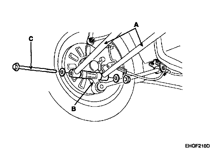 1. Remove the bolt (C) fixing the trailing arm (A) to the rear carrier (B).