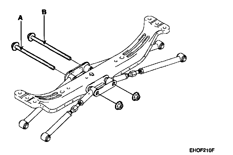 6. Remove the two rear suspension arm-to-cross member bolts (A, B).
