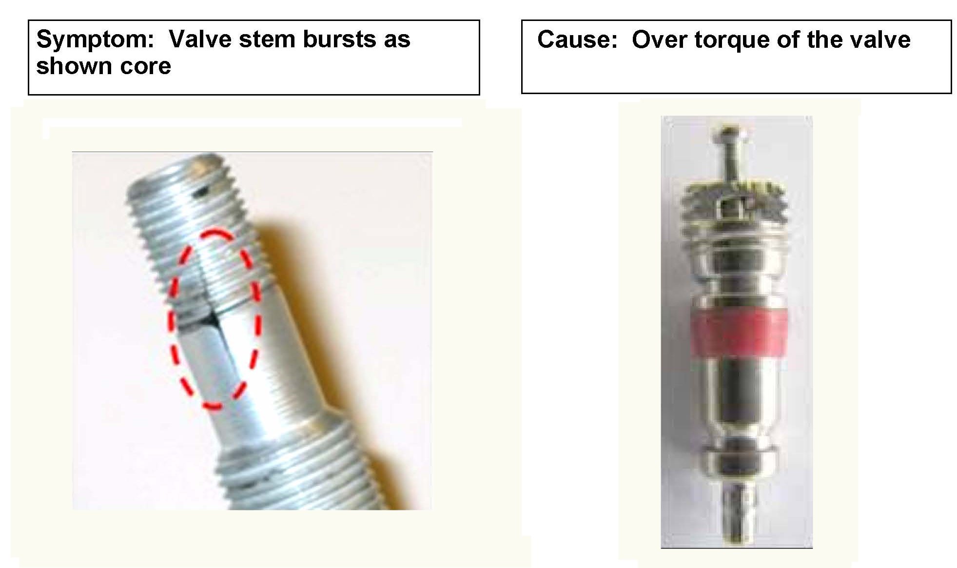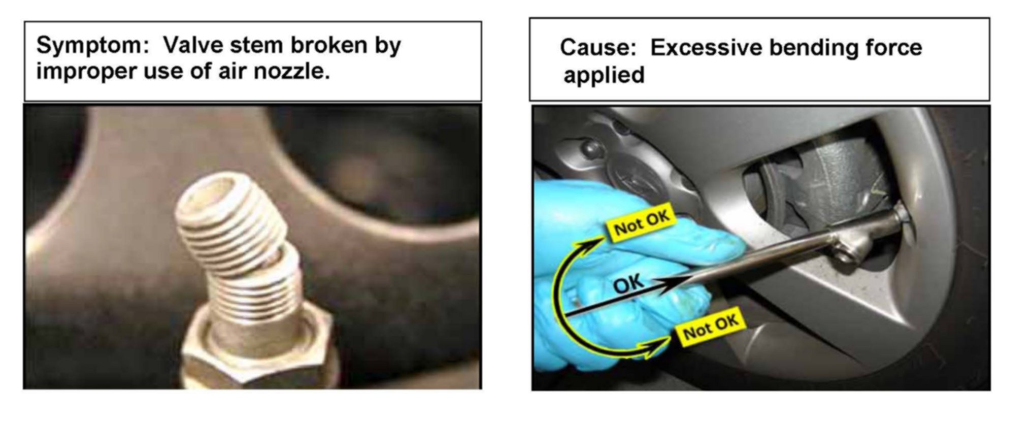 The valve stem may break during tire inflation or deflation while using a long air-filling nozzle tube as shown.