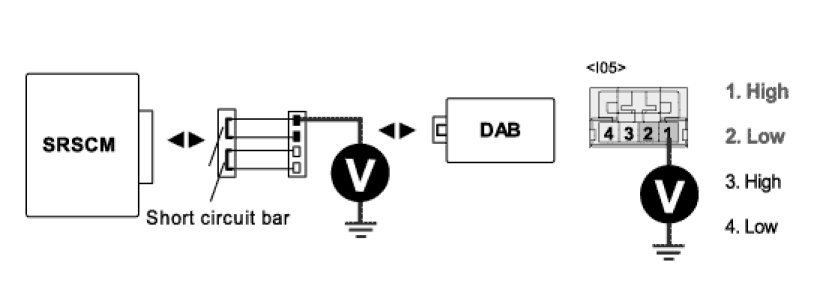 4. Measure voltage between terminal "1 or 2" of the DAB harness connector and chassis ground.