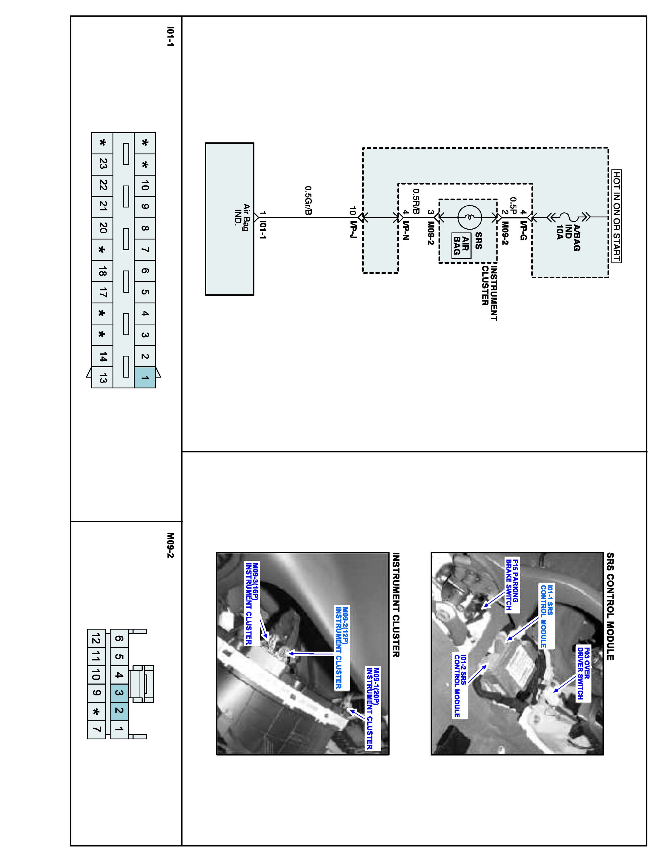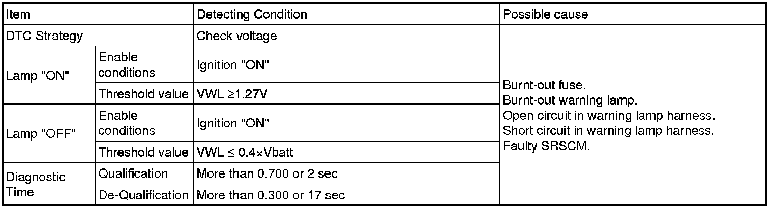 Air bag warning lamp is located at cluster. When key is in 'ignition on' position, SRSCM performs diagnosis of overall air bag system.If there's no fault, air bag. Warning lamp in cluster flickers for a while and then goes out. SRSCM measures voltage of out terminal of warning lamp to check if warning lamp is operated in accordance with signal SRSCM sends.