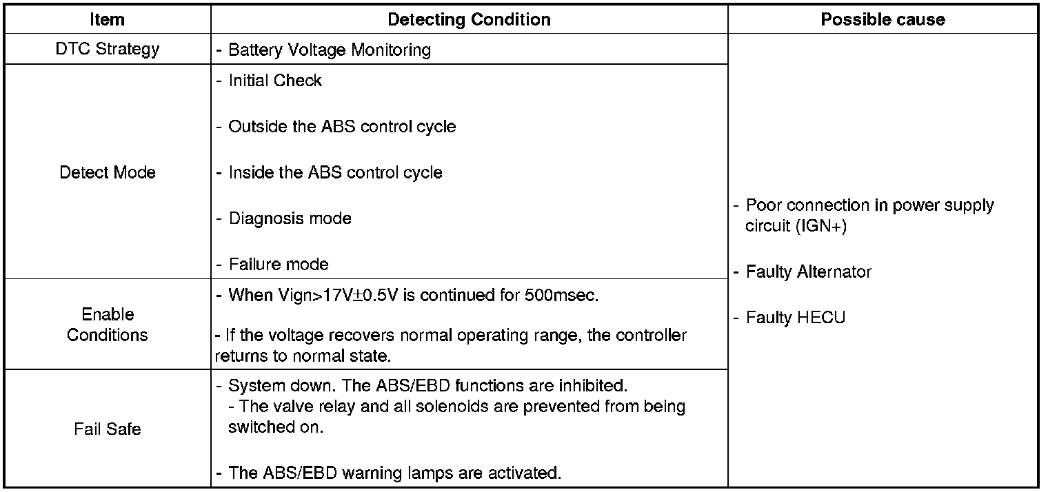 When the voltage is higher than the expected normal value, this code is set, and the ABS/EBD functions are prohibited. If the voltage recovers, to within normal operating ranges, then the controller returns to normal operation as well.