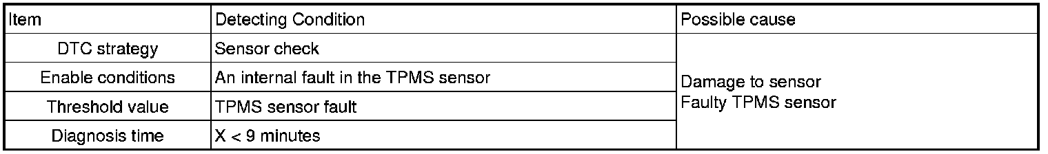 When 4 sensors have been learned as road wheels, it shall not be possible to learn new road wheel sensors on the same Ignition cycle. In normal mode low line, tire pressure and temperature shall be transmitted every 3 minutes 20s nominally independent of vehicle operation. Monitoring shall be every 20s. If sensor detects rapid deflation, then RF messages will be transmitted every 4s for 1 minute duration. Communication from wheel sensors shall be via RF at a frequency of 315 MHz, 5 kBaud.