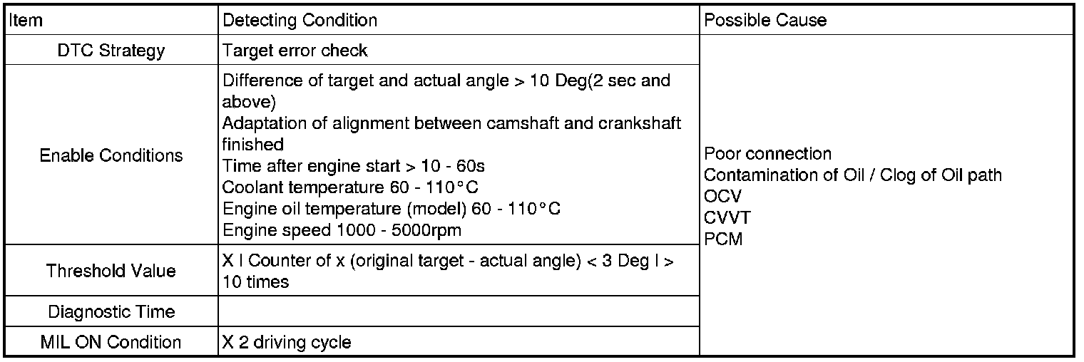 If "Counter of x (original target - actual angle) > 3 Deg" is over 10 times under enable conditions, PCM sets DTC P0012.