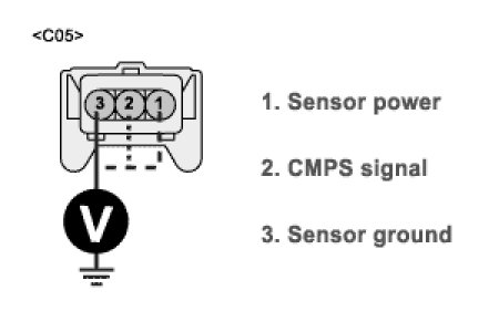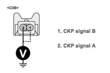 4. Measure the voltage Between terminal 1, 2 of CKPS harness connector and chassis ground.