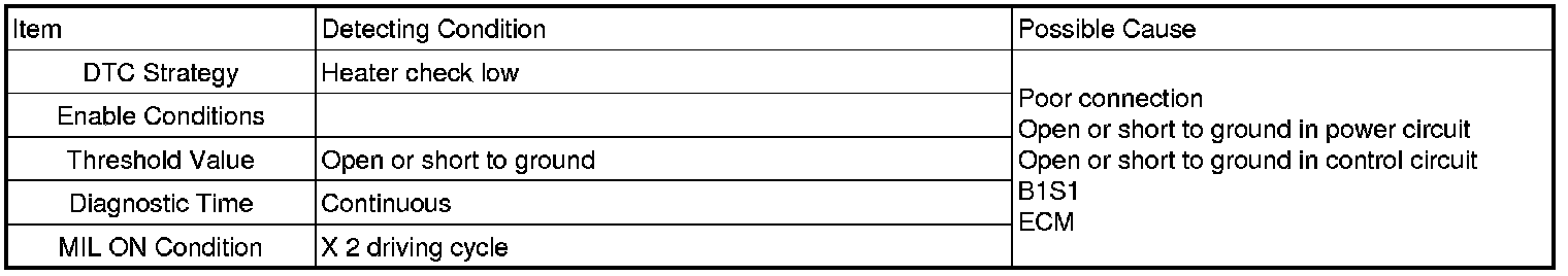 When ECM detects open or short to ground in the heater control circuit (B1S1), ECM sets DTC P0031.