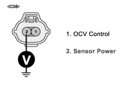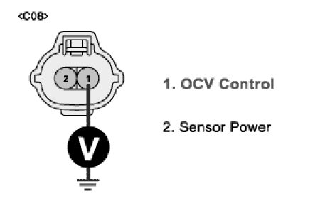 4. Measure voltage between terminal 2 of OCV harness connector and chassis ground.