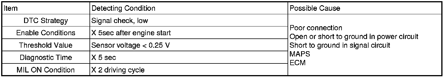 If sensor signal input is lower than 0.25V during 5 sec, PCM sets DTC P0107.