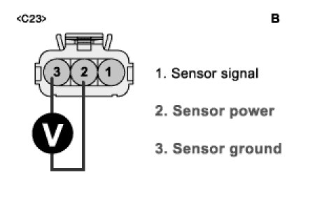 5. Measure the voltage between terminal 2 and 3 of TPS harness connector. (B)