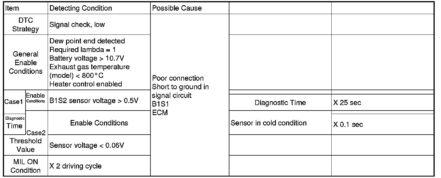 If the sensor output is below 0.06V under enable conditions, ECM sets DTC P0131.