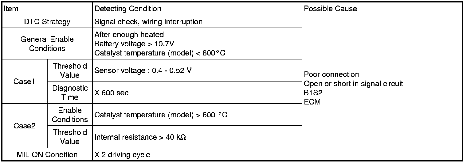 In case the sensor output is 0.4 - 0.52V during 600 sec or the internal resistance is over 40 kohms under enable conditions, ECM sets DTC P0136. (This DTC might be caused by the malfunction of Heater circuit, so, check the heater circuit first.)