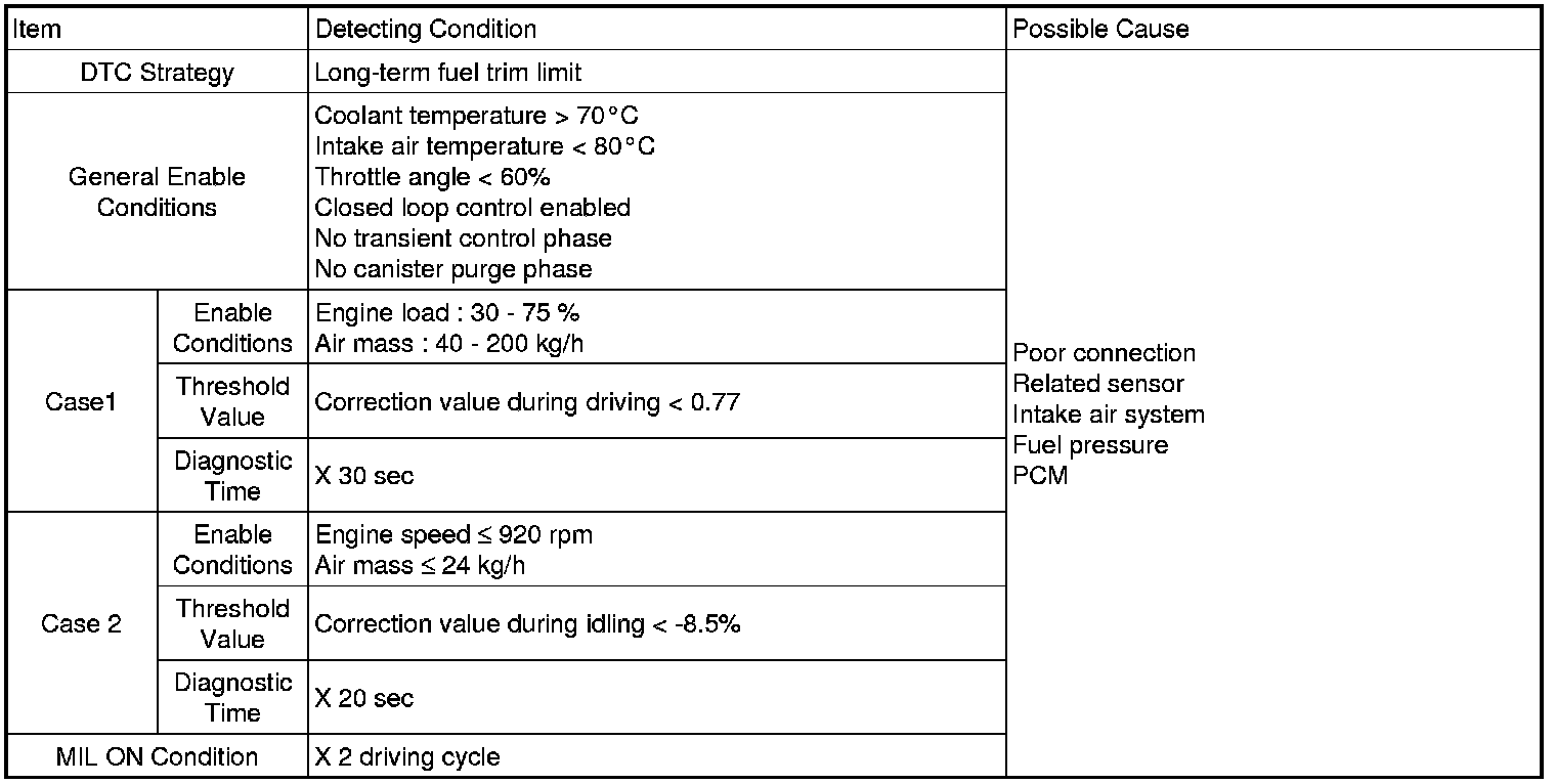If the correction value of air-fuel ratio is lower than the threshold value, PCM sets DTC P0172.