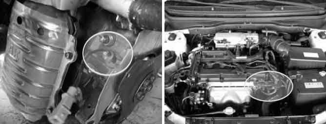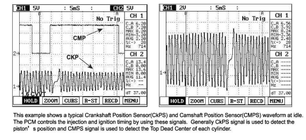 A Crankshaft Position Sensor (CKPS) is a magnetic type sensor that generates voltage using a sensor and a target wheel mounted on the crankshaft; there are 58 slots in the target wheel where one is longer than the others. When the slot in the wheel aligns with the sensor, the sensor voltage outputs low. When the metal (tooth) in the wheel aligns with the sensor, the sensor voltage outputs high. During one crankshaft rotation there are 58 rectangular signals and one longer signal. The PCM calculates engine RPM by using the sensor's signal and controls the injection duration and the ignition timing. Using the signal differences caused by the longer slot, the PCM identifies which cylinder is at top dead center.
