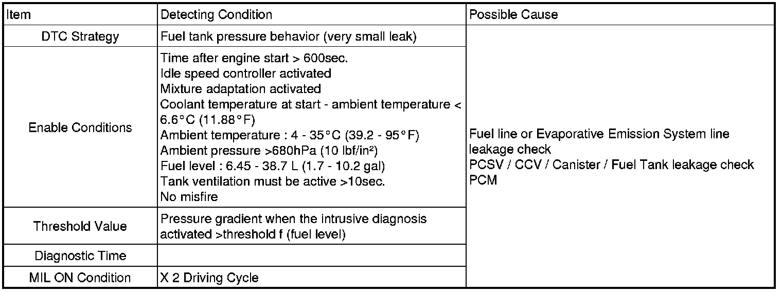 Due to the increasing ambient temperature of the fuel and the return of unused hot fuel from the engine, fuel vapors are generated in the tank. In order to control the release of these vapors to the atmosphere, the evaporative emissions control system is used. The evaporative emission control system reduces hydrocarbon (HC) emissions by trapping fuel tank vapors until they can be burned in the combustion process. Evaporating fuel is stored in a charcoal canister until it can be flushed into the intake manifold. The evaporative emission control system is made up of a fuel tank that can be completely sealed from outside air, a Fuel Tank Pressure Sensor (FTPS), a Canister Close Valve (CCV) that seals the canister from the outside air, a canister filled with activated charcoal granules, a Purge Control Solenoid Valve (PCSV). The evaporative emission system can be checked for leaks by sealing the system off from the outside air, creating a vacuum, and monitoring if the system can hold that vacuum sufficiently for a set amount of time. If it cannot, a leak exists somewhere in the system.