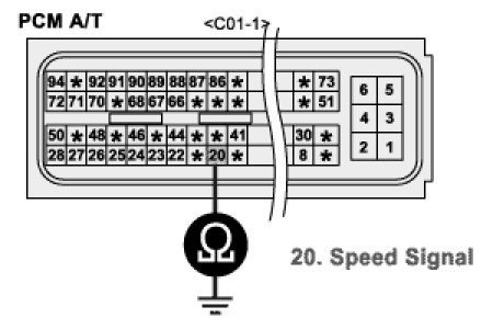 (4) Measure resistance between terminal 20/C01-1 of PCM harness connector and chassis ground. [A/T]