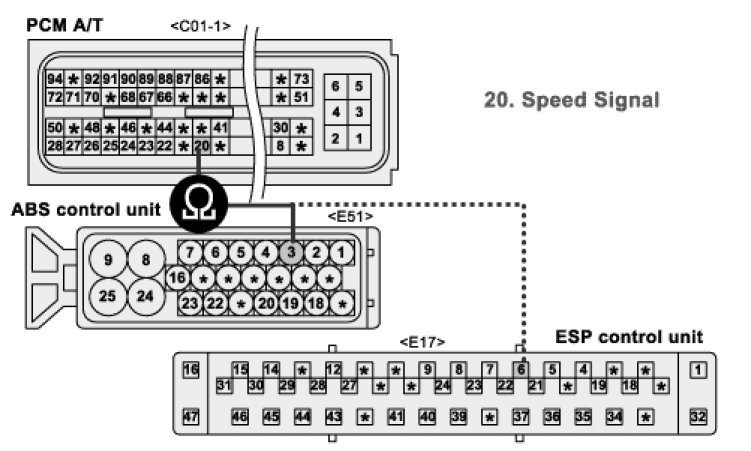 (4) Measure resistance between terminal 20/C01-1 of PCM harness connector and terminal 3/E51 (6/E17) of ABS (ESP) control module harness connector. (A/T)
