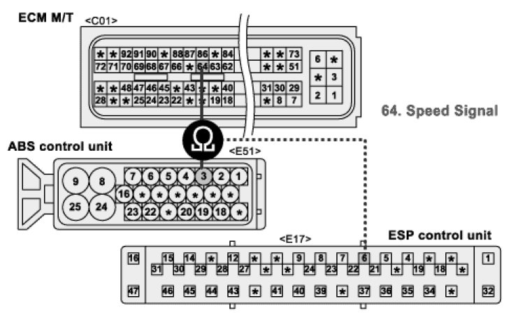 Measure resistance between terminal 64/C01 of ECM harness connector and terminal 3/E51 (6/E17) of ABS (ESP) control module harness connector. (M/T)